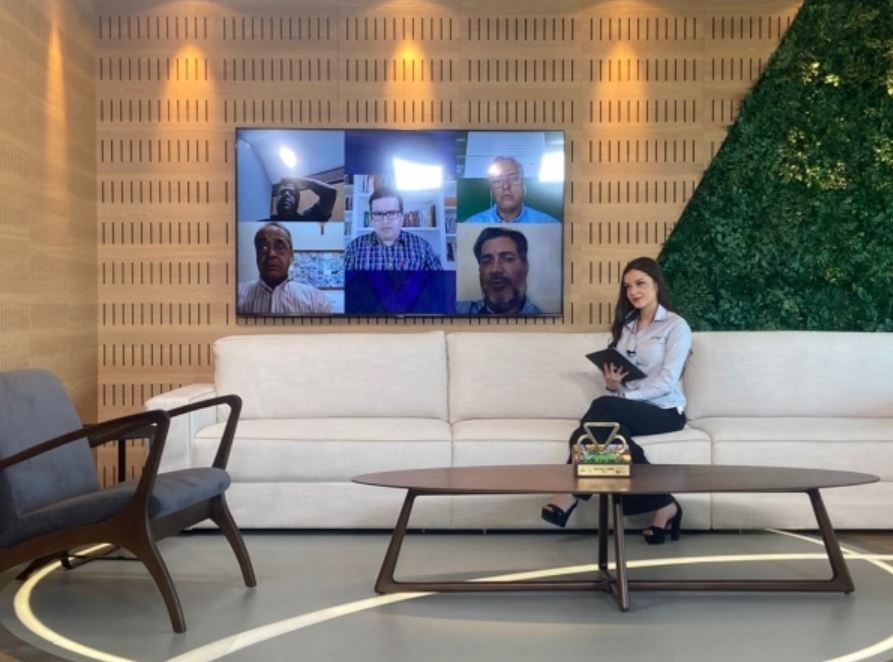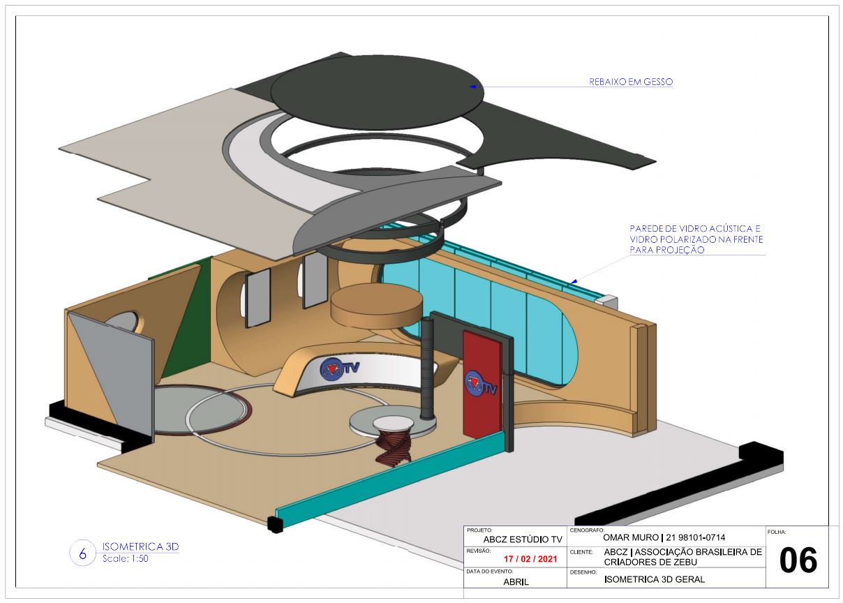O espaço foi totalmente reconstruido e adaptado a nova realidade com vidros acústicos para evitar ruídos externos do campo de eventos ao fundo Além disso foi fetio um estudo de iluminação por causa da baixa altura do teto por isso asumimos algumas luminarias no projeto. O espaço ficou mais amplo com a eliminação de 1 coluna e parede a esquerda desta forma conseguimos num único estúdio 5 dierentes espaços (balcão de noticias, sofa para entrevistados, bancada alta para temas sobre ciencia e tecnologia agropecuaria, área para conteúdo em realidade aumentada e painel em chroma para conteúdo virtual e podcast.